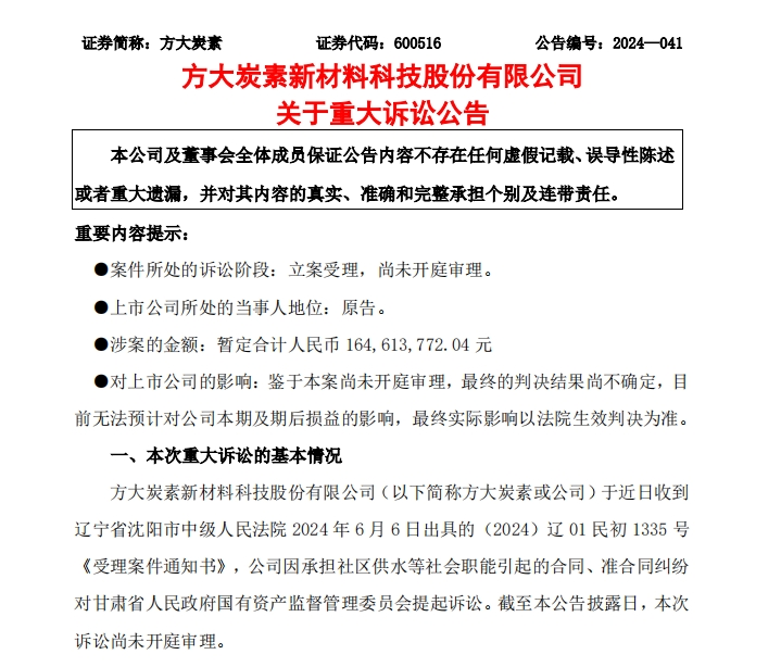 6月11日晚間,方大炭素新材料科技股份有限公司(下稱“方大炭素”)發(fā)布公告稱,公司近日收到遼寧省沈陽(yáng)市中級(jí)人民法院 2024年6月6日出具的(2024)遼01民初1335號(hào)《受理案件通知書(shū)》,公司因承擔(dān)社區(qū)供水等社會(huì)職能引起的合同、準(zhǔn)合同糾紛對(duì)甘肅省人民政府國(guó)有資產(chǎn)監(jiān)督管理委員會(huì)提起訴訟。截至本公告披露日,本次訴訟尚未開(kāi)庭審理。