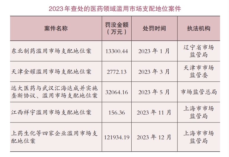 近日,市場(chǎng)監(jiān)管總局(國(guó)家反壟斷局)發(fā)布的《中國(guó)反壟斷執(zhí)法年度報(bào)告 (2023)》透露了這樣一組數(shù)據(jù):2023年全國(guó)查處壟斷協(xié)議、濫用市場(chǎng)支配地位案件27件,罰沒金額21.63億元。其中,涉及醫(yī)藥領(lǐng)域案件7件,所涉罰沒金額約17.72億元,占比超過8成。
