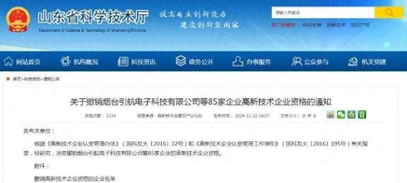 《通知》內(nèi)容顯示,根據(jù)《高新技術(shù)企業(yè)認(rèn)定管理辦法》(國科發(fā)火〔2016〕32號)和《高新技術(shù)企業(yè)認(rèn)定管理工作指引》(國科發(fā)火〔2016〕195號)有關(guān)規(guī)定,經(jīng)研究,決定撤銷煙臺(tái)引航電子科技有限公司等85家企業(yè)的高新技術(shù)企業(yè)資格。山東萊鋼永鋒鋼鐵有限公司則列于名單第78位,證書編號GR202237007406,撤銷起始年份為2023年。