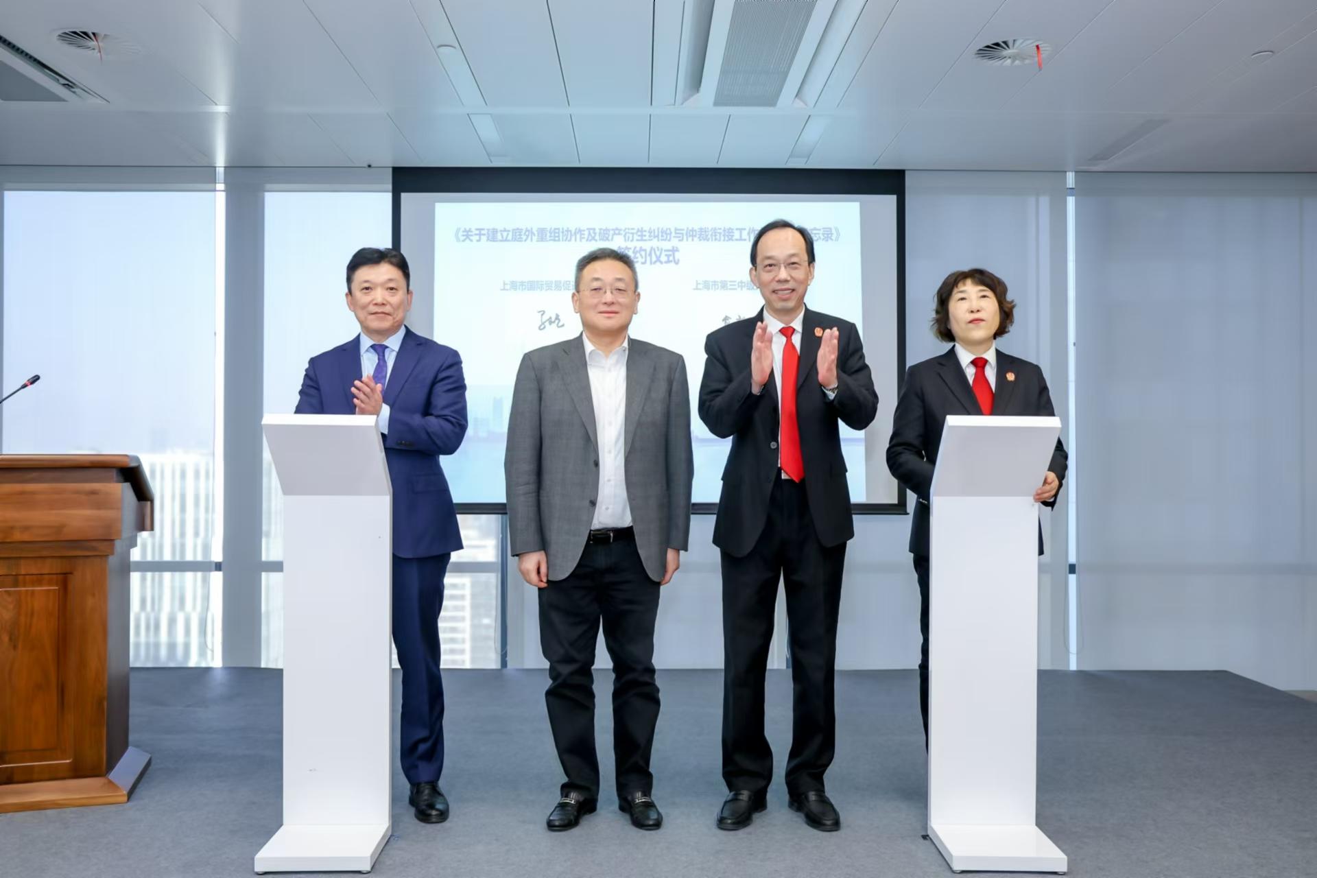 上海市國際貿(mào)易促進(jìn)委員會(huì)副會(huì)長、上海國仲副主任馬屹和上海市第三中級人民法院副院長俞秋瑋分別代表兩家單位簽署《備忘錄》,席建林院長與周敏浩會(huì)長共同見證。根據(jù)《備忘錄》的相關(guān)內(nèi)容,雙方未來將就庭外重組協(xié)作、破產(chǎn)衍生糾紛仲裁銜接等事宜開展合作,在制度設(shè)計(jì)、成本優(yōu)化等方面探索有效的訴仲協(xié)同機(jī)制,提高破產(chǎn)衍生糾紛的審理效率與專業(yè)度,提升上海法律服務(wù)機(jī)構(gòu)的品牌影響力。