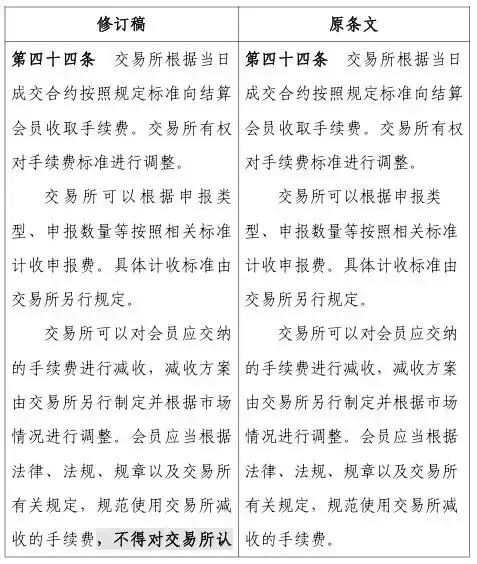 第四十四條規(guī)定,交易所可以對(duì)會(huì)員應(yīng)交納的手續(xù)費(fèi)進(jìn)行減收,減收方案由交易所另行制定并根據(jù)市場(chǎng)情況進(jìn)行調(diào)整。會(huì)員應(yīng)當(dāng)根據(jù)法律、法規(guī)、規(guī)章以及交易所有關(guān)規(guī)定,規(guī)范使用交易所減收的手續(xù)費(fèi),不得對(duì)交易所認(rèn)定的高頻交易者進(jìn)行手續(xù)費(fèi)減收。其中,“不得對(duì)交易所認(rèn)定的高頻交易者進(jìn)行手續(xù)費(fèi)減收”為新增內(nèi)容。