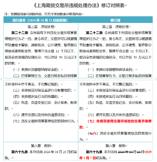 上海期貨交易所1月7日也發(fā)布公告稱,《上海期貨交易所結(jié)算管理辦法(修訂版)》《上海期貨交易所違規(guī)處理辦法(修訂版)》經(jīng)上期所理事會(huì)審議通過,并已報(bào)告中國證監(jiān)會(huì),現(xiàn)予以發(fā)布,自2025年1月7日起實(shí)施。