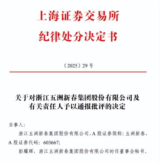 不過,五洲新春的這一系列動作并未能完全消除市場的疑慮。在股價異動后,公司雖然及時發(fā)布了澄清公告,但監(jiān)管機構(gòu)的處罰決定仍然如期而至。上交所對五洲新春及時任董事會秘書彭耀輝予以通報批評,浙江證監(jiān)局也對五洲新春及彭耀輝分別采取了出具警示函的監(jiān)督管理措施,并記入證券期貨市場誠信檔案。