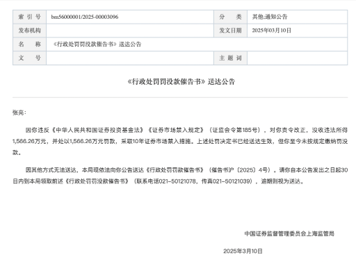 3月10日,中國(guó)證券監(jiān)督管理委員會(huì)上海監(jiān)管局(下稱(chēng)“上海證監(jiān)局”)發(fā)布一則《行政處罰罰沒(méi)款催告書(shū)》送達(dá)公告。