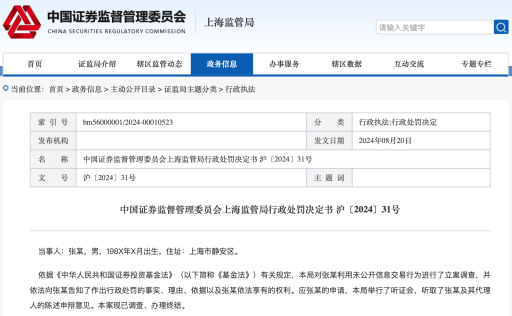 上海證監(jiān)局彼時(shí)表示,張某應(yīng)自收到該處罰決定書(shū)之日起15日內(nèi),將罰沒(méi)款匯交中國(guó)證監(jiān)會(huì),由該行直接上繳國(guó)庫(kù)。到期不繳納罰款的,上海證監(jiān)局可以每日按罰款數(shù)額的百分之三加處罰款。