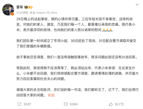 雷軍在社交媒體發(fā)文稱,29日晚的事故讓他心情極為沉重。三位年輕女孩不幸離世,這對其家人、朋友乃至每個人而言都是難以承受之痛。他代表小米表達(dá)最深切哀悼,并向家屬致以誠摯慰問。
