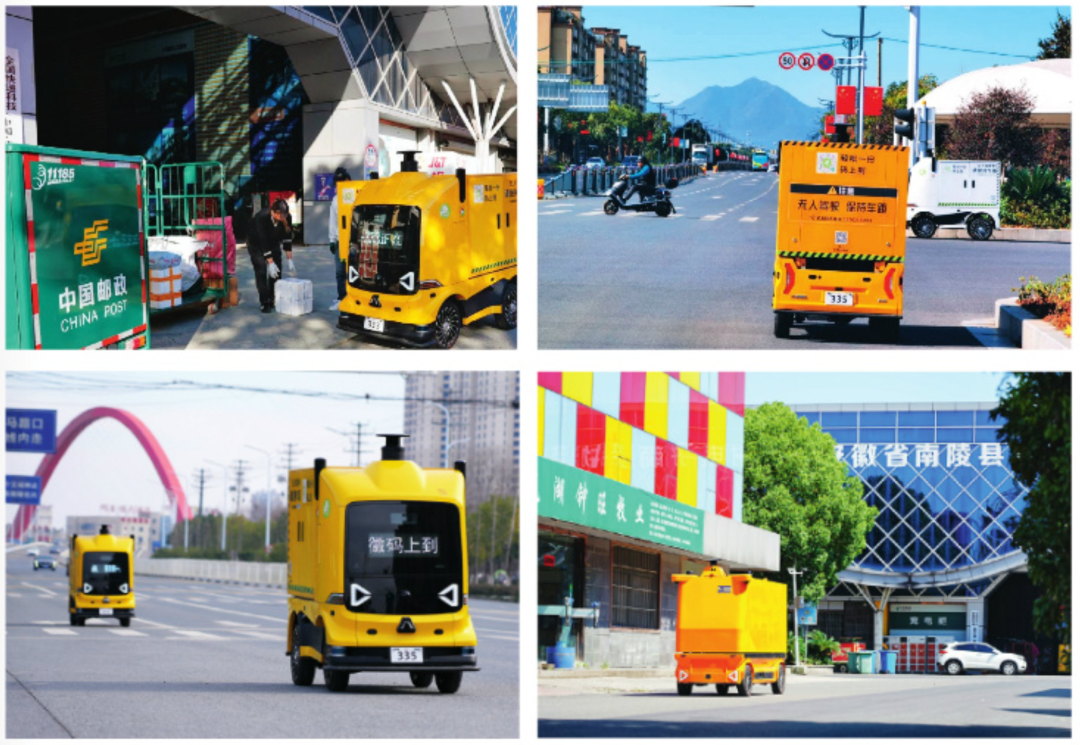 ▲在安徽省南陵縣道路上行駛的無人快遞車,實現(xiàn)從快遞終點站到小區(qū)快遞驛站“最后一公里”的快遞轉(zhuǎn)運。受訪者供圖