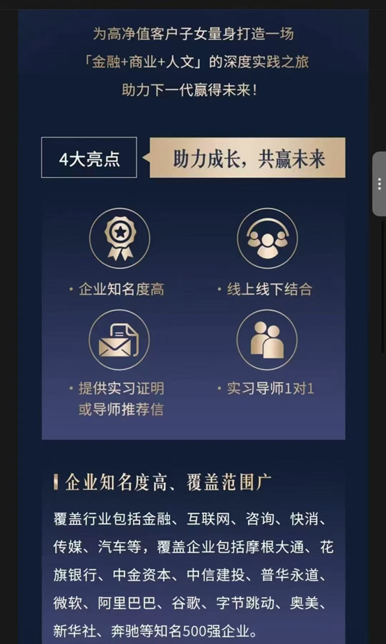 日前,興業(yè)銀行私人銀行推出一項(xiàng)“2025菁英實(shí)習(xí)計(jì)劃”,可以為高凈值客戶的子女提供知名企業(yè)實(shí)習(xí)機(jī)會(huì),覆蓋行業(yè)涉及金融、互聯(lián)網(wǎng)、咨詢快消等行業(yè)。