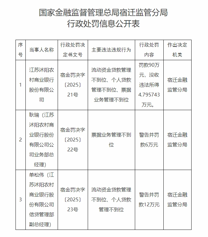 根據(jù)行政處罰信息,沭陽(yáng)農(nóng)商銀行主要存在3項(xiàng)違法違規(guī)行為:流動(dòng)資金貸款管理不到位、個(gè)人貸款管理不到位、票據(jù)業(yè)務(wù)管理不到位。因此,宿遷金融監(jiān)管分局對(duì)其作出罰款90萬(wàn)元、沒(méi)收違法所得4.795743萬(wàn)元的行政處罰。