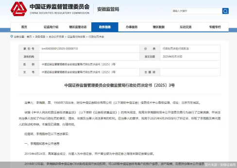 5月30日,安徽證監(jiān)局發(fā)布公告指出,時(shí)任中信證券信息技術(shù)中心高級(jí)經(jīng)理李海鵬存在違法行為,其獲得中信證券CRM系統(tǒng)應(yīng)用開(kāi)發(fā)崗權(quán)限,可以獲取中信證券所有客戶(hù)的賬戶(hù)信息、資產(chǎn)規(guī)模、交易持倉(cāng)等未公開(kāi)信息。2019年11月1日至2023年2月21日,李海鵬通過(guò)CRM系統(tǒng),獲知高某基金的持倉(cāng)、委托、當(dāng)日成交記錄等未公開(kāi)信息,其利用未公開(kāi)信息違規(guī)交易股票,同時(shí)存在趨同交易的情況。安徽證監(jiān)局決定,沒(méi)收李海鵬違法所得213.14萬(wàn)元,并處以213.14萬(wàn)元罰款。