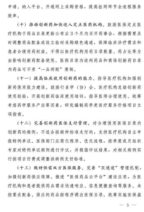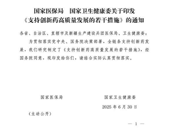據(jù)國(guó)家醫(yī)保局網(wǎng)站消息,國(guó)家醫(yī)保局、國(guó)家衛(wèi)生健康委6月30日印發(fā)《支持創(chuàng)新藥高質(zhì)量發(fā)展的若干措施》。其中提到,加大創(chuàng)新藥研發(fā)支持力度,支持創(chuàng)新藥進(jìn)入基本醫(yī)保藥品目錄和商業(yè)健康保險(xiǎn)創(chuàng)新藥品目錄,支持創(chuàng)新藥臨床應(yīng)用,提高創(chuàng)新藥多元支付能力。
