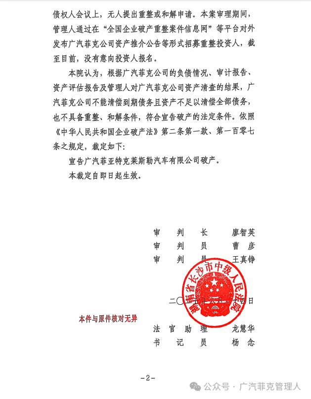 因廣汽菲克公司已無(wú)重整可能,根據(jù)部分債權(quán)人意見(jiàn),經(jīng)債權(quán)人委員會(huì)討論,管理人已經(jīng)申請(qǐng)長(zhǎng)沙中院裁定宣告廣汽菲克公司破產(chǎn)。附:長(zhǎng)沙中院《民事裁定書(shū)》(2022)湘01破214號(hào)-2號(hào)。