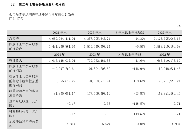 2024年,廣聯(lián)航空實(shí)現(xiàn)營業(yè)收入10.48億元,同比增長41.64%;歸屬于上市公司股東的凈利潤虧損4909.78萬元,由盈轉(zhuǎn)虧。