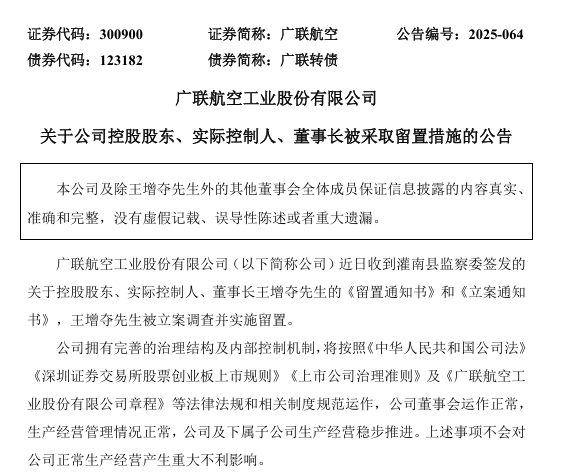7月22日晚間,廣聯(lián)航空公告,控股股東、實(shí)控人、董事長王增奪被立案調(diào)查并實(shí)施留置。
