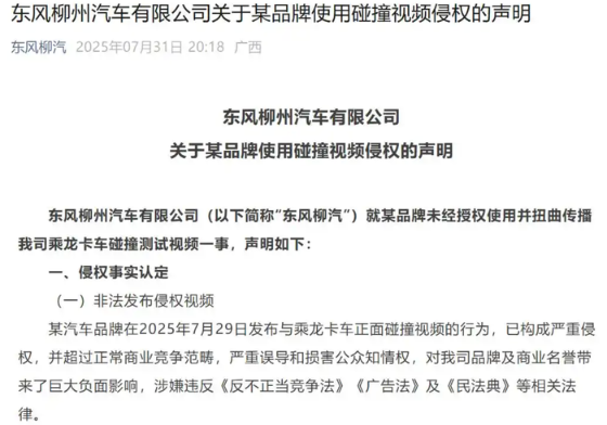 7月31日晚間,東風柳州汽車有限公司(簡稱“東風柳汽”)發(fā)布關(guān)于某品牌未經(jīng)授權(quán)使用并扭曲傳播東風柳汽旗下商用車品牌乘龍卡車碰撞視頻侵權(quán)的聲明。