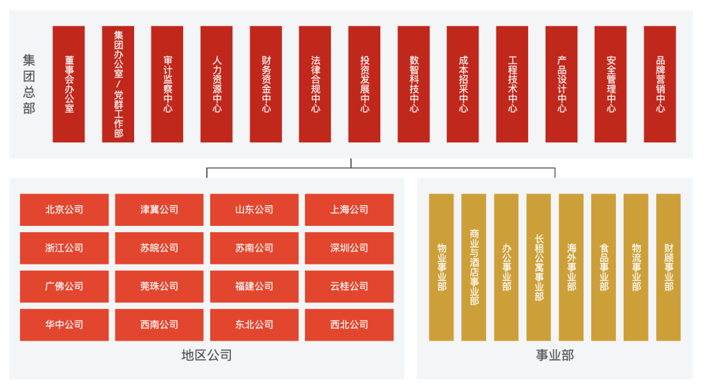 根據(jù)最新的組織架構(gòu),萬科集團(tuán)總部除了董事會辦公室、集團(tuán)辦公室/黨群工作部外,還設(shè)有投資發(fā)展中心、成本招采中心、工程技術(shù)中心、產(chǎn)品設(shè)計(jì)中心等11個(gè)中心;地區(qū)公司分為北京公司、津冀公司、山東公司、上海公司等16個(gè)公司;原物業(yè)事業(yè)集團(tuán)(BG)等統(tǒng)一歸為事業(yè)部,目前包含物業(yè)、商業(yè)與酒店、辦公、長租公寓、物流等八大多元化業(yè)務(wù)。
