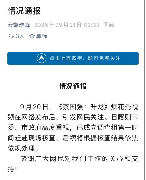 9月21日,“云端珠峰”微信公眾號(hào)發(fā)布情況通報(bào)指出,日喀則市委、市政府高度重視,已成立調(diào)查組第一時(shí)間趕赴現(xiàn)場(chǎng)核查,后續(xù)將根據(jù)核查結(jié)果依法依規(guī)處理。