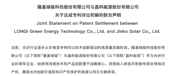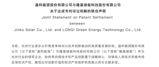 聲明以中英雙語呈現(xiàn),稱隆基綠能與晶科能源聯(lián)合宣布,就雙方及雙方關(guān)聯(lián)公司在全球范圍內(nèi)正在進(jìn)行的相關(guān)專利主張和法律事項(xiàng),達(dá)成和解協(xié)議。
