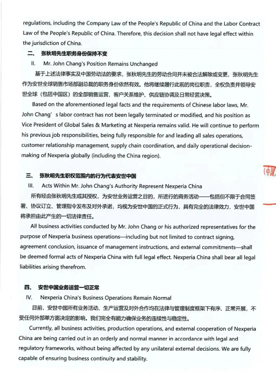 10月23日,安世半導(dǎo)體中國有限公司發(fā)布聲明稱,近期荷蘭總部單方面免去張秋明銷售市場部副總裁職務(wù)的決定,在中國法域下不發(fā)生法律效力。