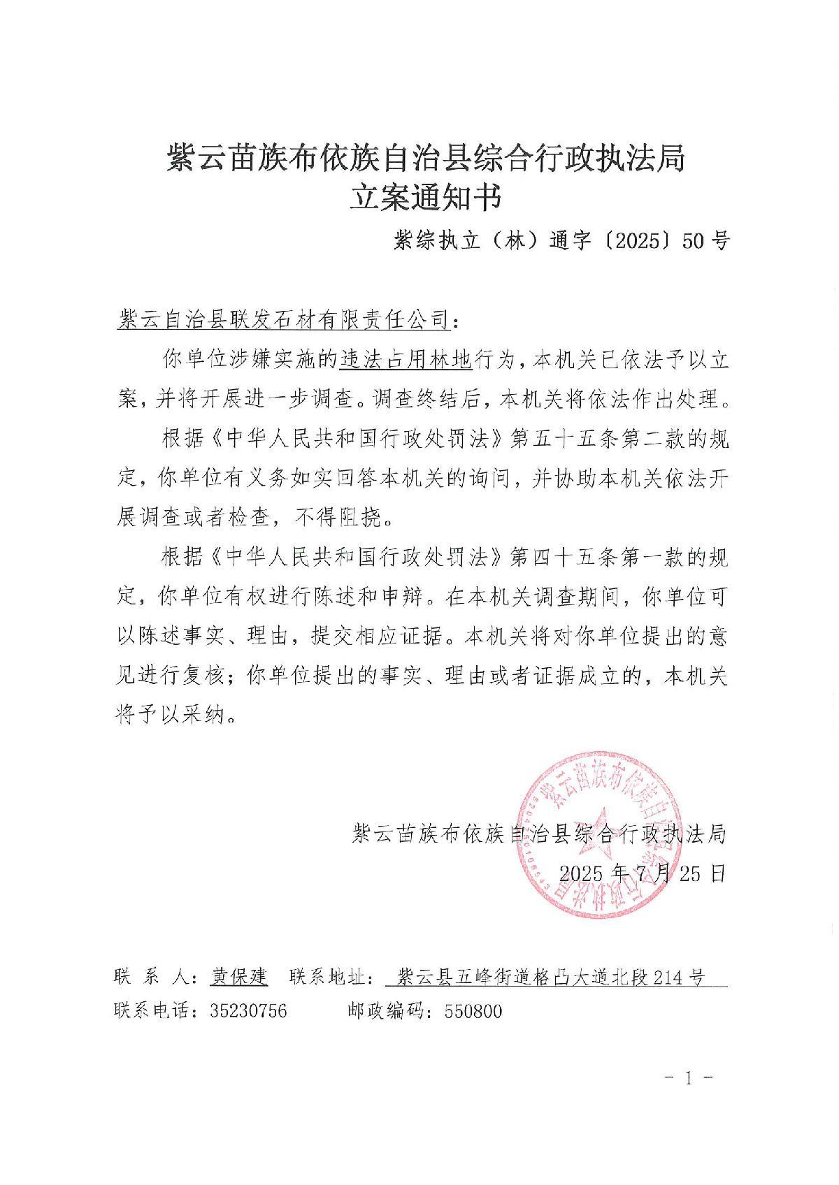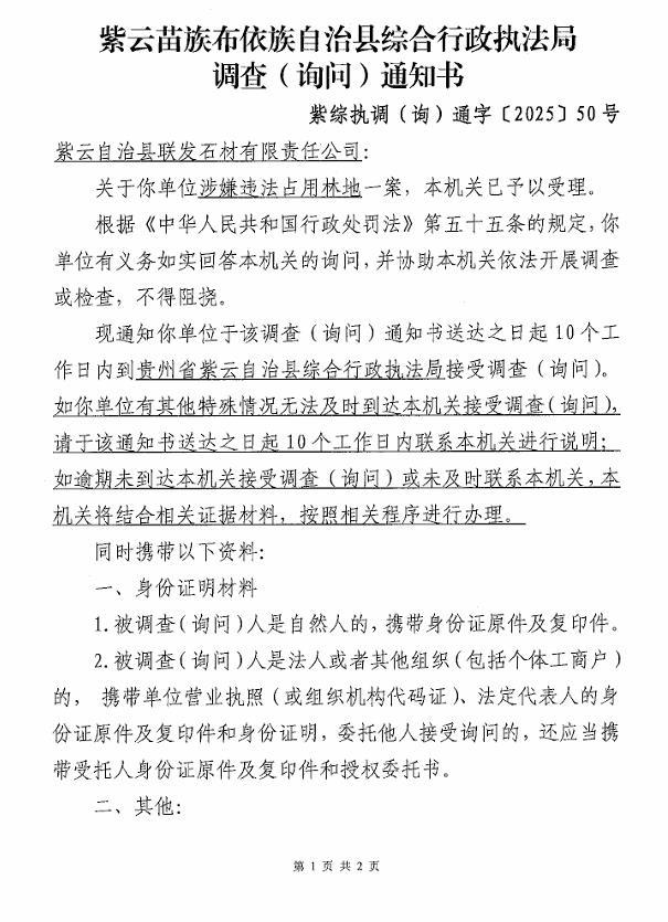 因你公司涉嫌在貴州省紫云自治縣貓營鎮(zhèn)普卡橋村違法占用林地一案,我機(jī)關(guān)依法向你公司公告送達(dá)《立案通知書》【紫綜執(zhí)立(林)通字〔2025〕50號(hào)】及《調(diào)查(詢問)通知書》【紫綜執(zhí)調(diào)(詢)通字〔2025〕50號(hào)】。請(qǐng)于本公告送達(dá)之日起10個(gè)工作日內(nèi)到本機(jī)關(guān)接受調(diào)查、詢問(地址:貴州省紫云自治縣五峰街道格凸大道北段214號(hào);電話:0851-35230756),進(jìn)行陳述、申辯。逾期未聯(lián)系本機(jī)關(guān),本機(jī)關(guān)將依法處理。如對(duì)公告送達(dá)方式有異議,請(qǐng)于本公告發(fā)布之日起7個(gè)工作日內(nèi)提出異議,若逾期未提出異議,上述文書自本公告發(fā)出之日起三十日,即視為送達(dá)。(見本公告后請(qǐng)聯(lián)系本機(jī)關(guān)簽收上述文書)