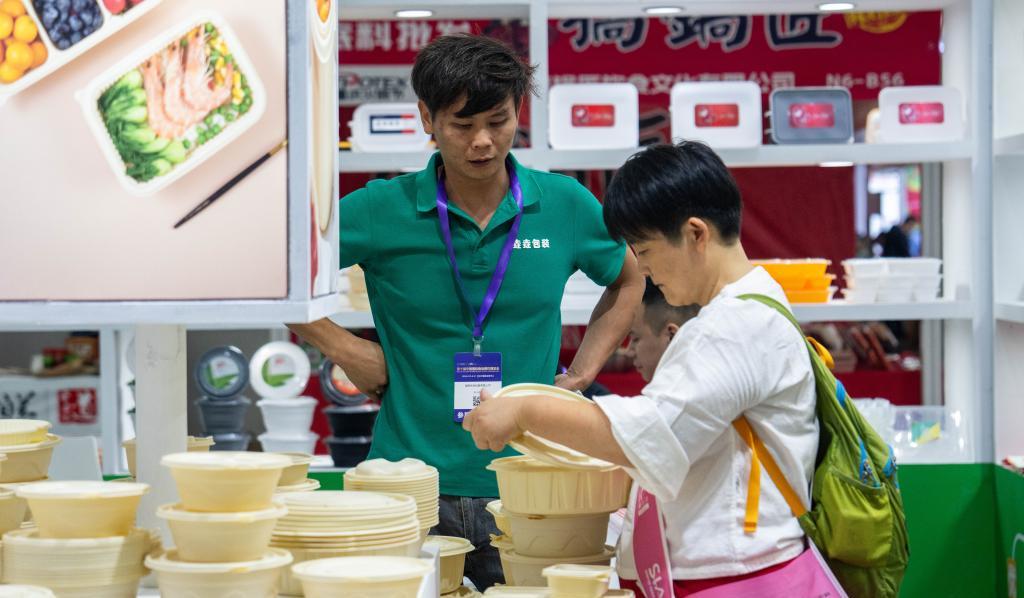 9月19日,在長沙國際會展中心,觀眾(右)在了解一次性飯盒。新華社記者 陳思汗 攝