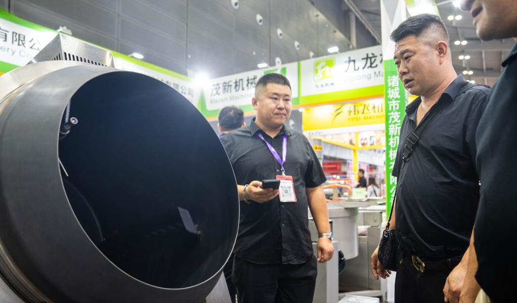 9月19日,在長沙國際會展中心,觀眾(右)在了解商用炒菜設(shè)備。新華社記者 陳思汗 攝