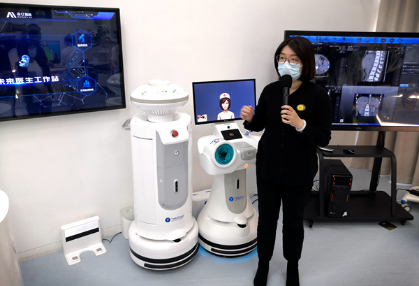圖為工作人員為記者介紹曾經(jīng)用在新冠肺炎疫情防控一線的智能消殺機(jī)器人。人民網(wǎng)記者 孫博洋攝
