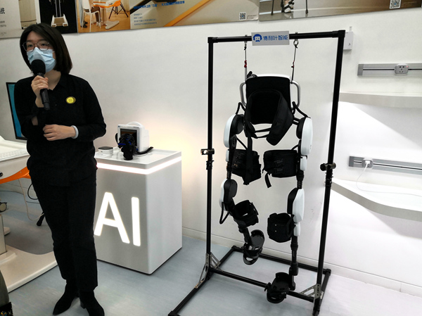 張江人工智能島AI體驗中心工作人員為記者講解人工智能在醫(yī)療方面的應(yīng)用,圖為下肢外骨骼康復(fù)機(jī)器人。人民網(wǎng)記者 孫博洋攝