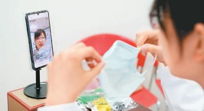 在上海市黃浦區(qū)打浦橋街道社區(qū)衛(wèi)生服務(wù)中心,家庭醫(yī)生在直播中與居民就戴口罩的問題進(jìn)行互動。新華社記者 劉 穎攝