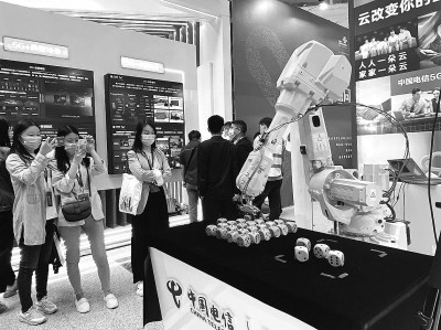 5月17日,2021年世界電信和信息社會日大會上,人們正在圍觀一款5G工業(yè)機(jī)器人。本報(bào)記者 劉坤攝/光明圖片