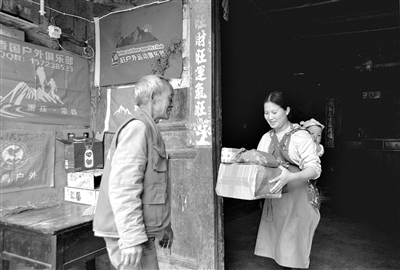 2020年下半年,漢源郵政在古路村設(shè)立了村郵站,村民通過電商平臺購物變得更加方便,村里的花椒、核桃、臘肉等土特產(chǎn)品也拓寬了銷售渠道。圖為郵政代辦員向開強(左)把包裹送到村民李娟家中。 記者 江宏景 攝