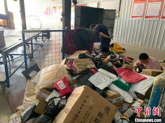 在江西省萍鄉(xiāng)市蘆溪縣供銷集配第四方物流分揀中心內(nèi),一名工作人員正在分揀各快遞公司的快件。 李韻涵 攝