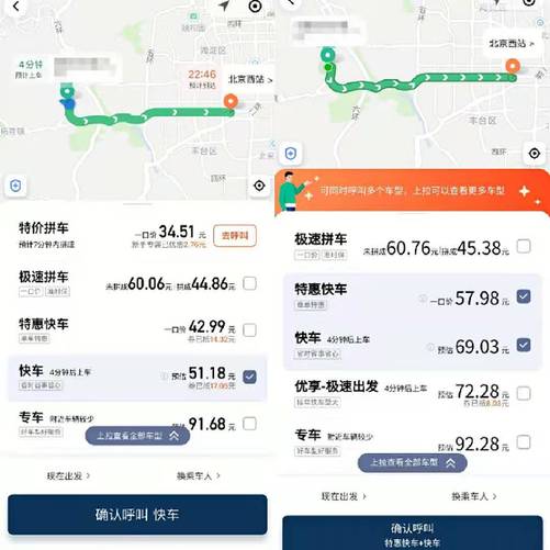 ——記者在某網(wǎng)約車平臺上搜索發(fā)現(xiàn),在同一時間于同一地點出發(fā)至北京西站,經(jīng)常使用該網(wǎng)約車平臺的用戶手機內(nèi)顯示的快車打車費用預(yù)估為69.03元。但不經(jīng)常使用該平臺的用戶手機上顯示,打車費用預(yù)計為51.18元,其中包含了17.05元被抵扣的優(yōu)惠券。但記者發(fā)現(xiàn),即便不選擇使用優(yōu)惠券抵扣車費,不經(jīng)常使用該平臺的用戶打車費用是68.23元,比常用用戶顯示的車費還便宜0.8元。
