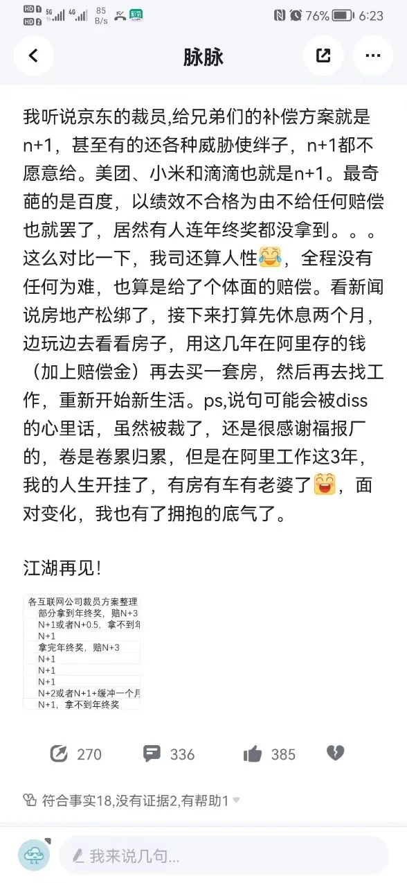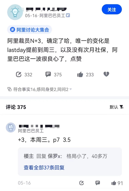 有阿里員工發(fā)文稱,“今天被約談了,這周五走N+3,緩沖29天是N+1,去年的校招生,目前手里沒offer,正在面試”。該員工還糾結(jié)是再待一個月還是拿n+3走人。還有員工發(fā)文證實阿里裁員N+3,并稱和之前流傳消息不同的是,最后期限提前到周三以及沒有次月社保。