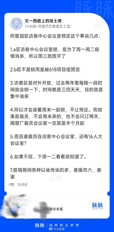 針對上述爆料,另一阿里員工當天在脈脈發(fā)布長文回應(yīng)稱,A區(qū)訪客中心會議室被鎖是為了疫情消殺,B區(qū)是被618項目組預(yù)定,訪客區(qū)是對外開放的,過去兩年里每隔一段時間就會因集中消殺而封鎖,時間都是三四天。