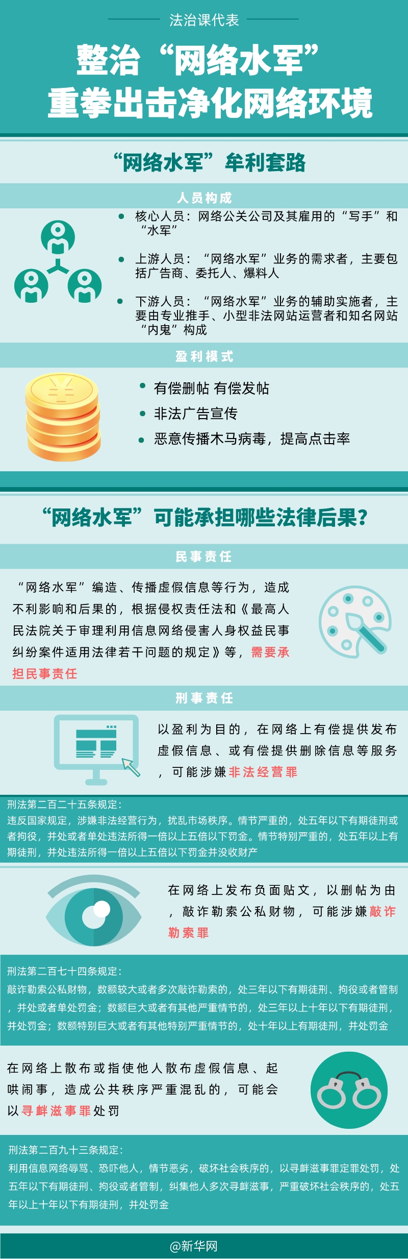 6月27日,公安部網(wǎng)安局在全國范圍內(nèi)啟動(dòng)為期6個(gè)月的依法打擊整治“網(wǎng)絡(luò)水軍”專項(xiàng)工作?!熬W(wǎng)絡(luò)水軍”的牟利套路有哪些?可能承擔(dān)哪些法律后果?一圖帶你了解一下!