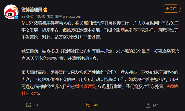 3月21日,“微博管理員”表示, MU5735 客機事件牽動人心,相關部門已迅速開展救援工作,廣大網(wǎng)友也通過平臺關注事態(tài)發(fā)展,祈愿平安。但站方在巡查中發(fā)現(xiàn),有極個別網(wǎng)友發(fā)布幸災樂禍、調(diào)侃災難等不當言論,對此,站方堅決反對并嚴肅處置。