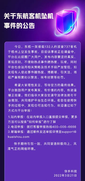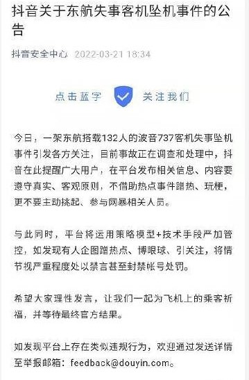 此外,快手、抖音等也都發(fā)布了關于 MU5735 客機事件的相關公告,對于借此事件蹭熱度、博眼球、引關注,將視嚴重程度處以禁言、帳號封禁等處罰。