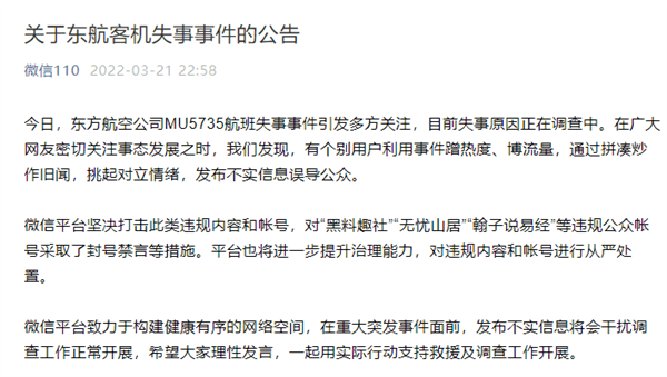 3月21日,據(jù)“微信110”公眾號消息,東方航空公司MU5735航班失事事件引發(fā)廣泛關注,目前失事原因正在調(diào)查中。在廣大網(wǎng)友密切關注事態(tài)發(fā)展之時,平臺發(fā)現(xiàn),有個別用戶利用事件蹭熱度、博流量,通過拼湊炒作舊聞,挑起對立情緒,發(fā)布不實信息誤導公眾。