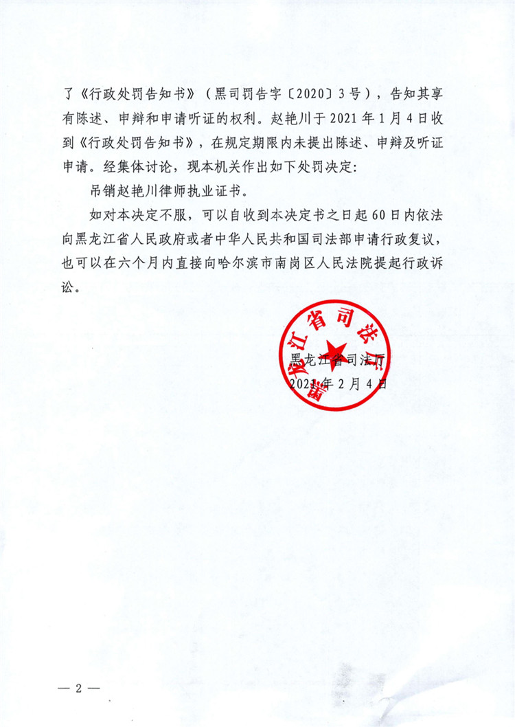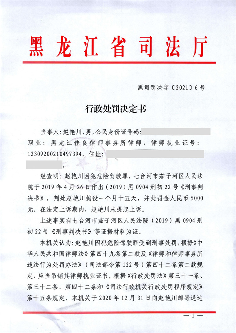 黑龍江律師趙艷川因故意犯罪被處吊銷律師執(zhí)業(yè)證書