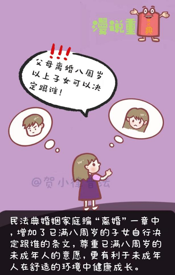 民法典婚姻家庭編“離婚”一章中,增加了已滿八周歲的子女自行決定跟誰的條文,尊重已滿八周歲的未成年人的意愿,更有利于未成年人在舒適的環(huán)境中健康成長。