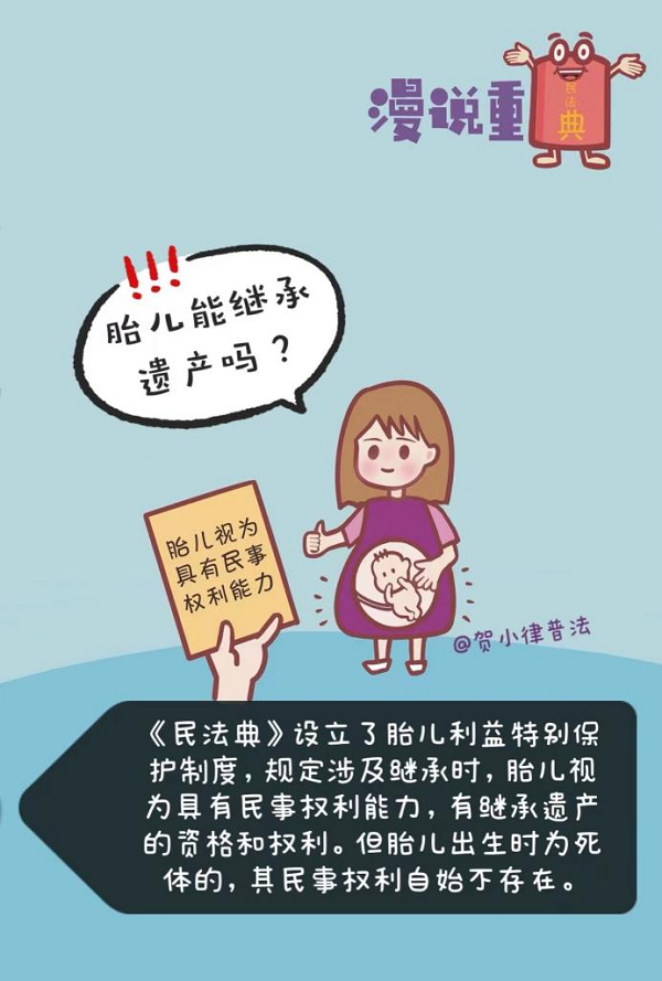 《中華人民共和國民法典》第十六條 【胎兒利益保護(hù)】涉及遺產(chǎn)繼承、接受贈(zèng)與等胎兒利益保護(hù)的,胎兒視為具有民事權(quán)利能力。但是,胎兒娩出時(shí)為死體的,其民事權(quán)利能力自始不存在。