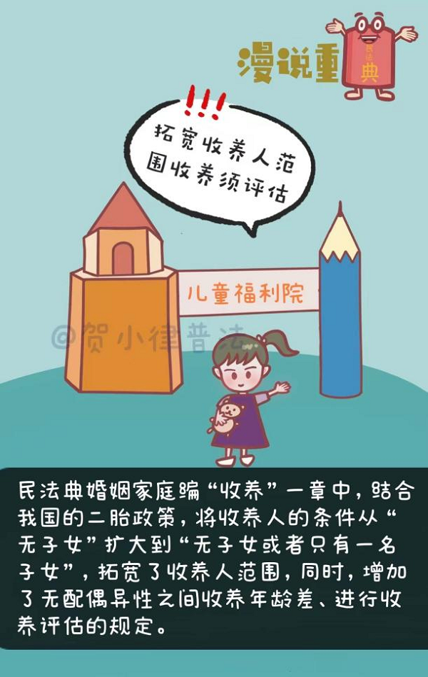 民法典婚姻家庭編“收養(yǎng)”一章中,結(jié)合我國的二胎政策,將收養(yǎng)人的條件從“無子女”擴(kuò)大到“無子女或者只有一名子女”,拓寬了收養(yǎng)人的范圍,同時(shí),增加了無配偶異性之間收養(yǎng)年齡差、進(jìn)行收養(yǎng)評(píng)估的規(guī)定。