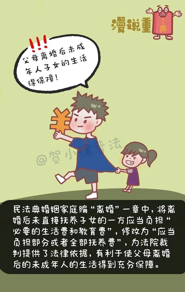 民法典婚姻家庭編“離婚”一章中,將離婚后未直接撫養(yǎng)子女的一方應(yīng)當(dāng)負(fù)擔(dān)“必要的生活費(fèi)和教育費(fèi)”,修改為“應(yīng)當(dāng)負(fù)擔(dān)部分或者全部撫養(yǎng)費(fèi)”,為法院裁判提供了法律依據(jù),有利于使父母離婚后的未成年人的生活得到充分保障。
