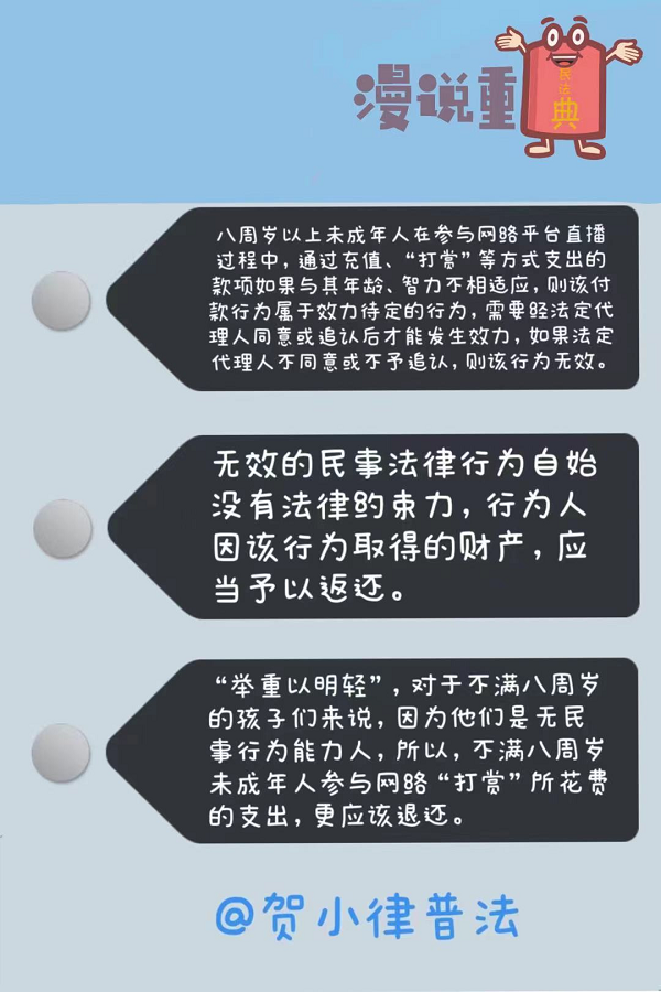 最高人民法院《關(guān)于依法妥善審理涉新冠肺炎疫情民事案件若干問題的指導(dǎo)意見(二)》明確,八周歲以上的未成年人未經(jīng)其監(jiān)護(hù)人同意,參與網(wǎng)絡(luò)付費(fèi)游戲或者網(wǎng)絡(luò)直播平臺(tái)“打賞”等方式支出與其年齡、智力不相適應(yīng)的款項(xiàng),監(jiān)護(hù)人請(qǐng)求網(wǎng)絡(luò)服務(wù)提供者返還該款項(xiàng)的,人民法院應(yīng)予支持。