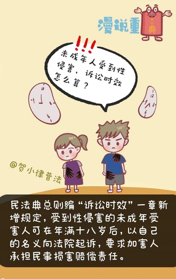《中華人民共和國民法典》第一百九十一條 【未成年人遭受性侵害的損害賠償訴訟時(shí)效的起算】未成年人遭受性侵害的損害賠償請(qǐng)求權(quán)的訴訟時(shí)效期間,自受害人年滿十八周歲之日起計(jì)算。