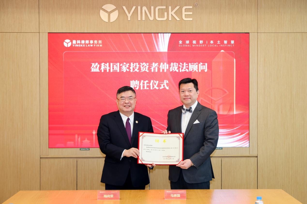 梅向榮為馬恩國(guó)頒發(fā)聘書,正式聘任其為盈科國(guó)家投資者仲裁法顧問(wèn)。
