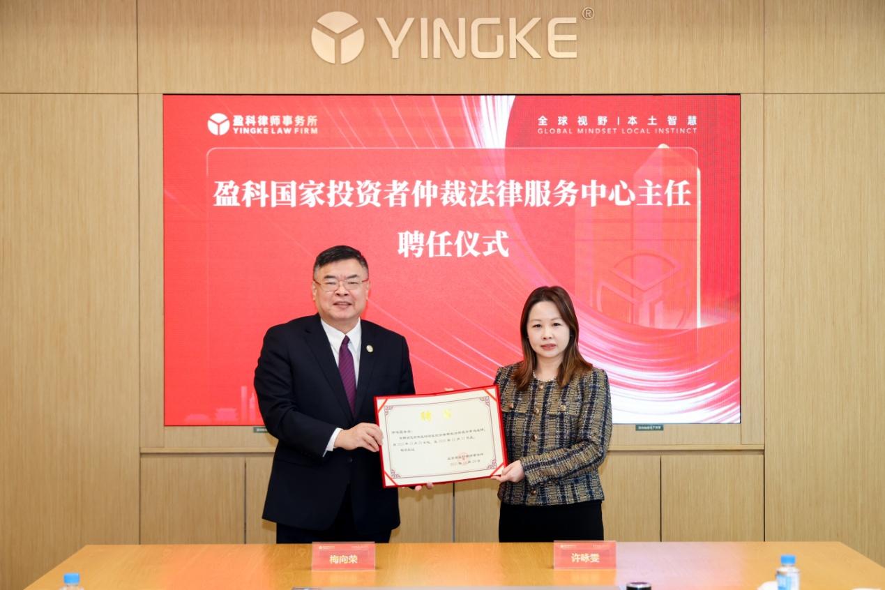 梅向榮為許詠雯頒發(fā)聘書,正式聘任其為盈科國(guó)家投資者仲裁法律服務(wù)中心主任。