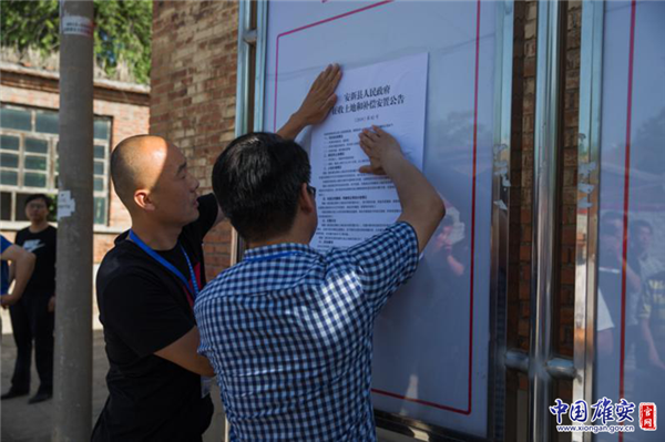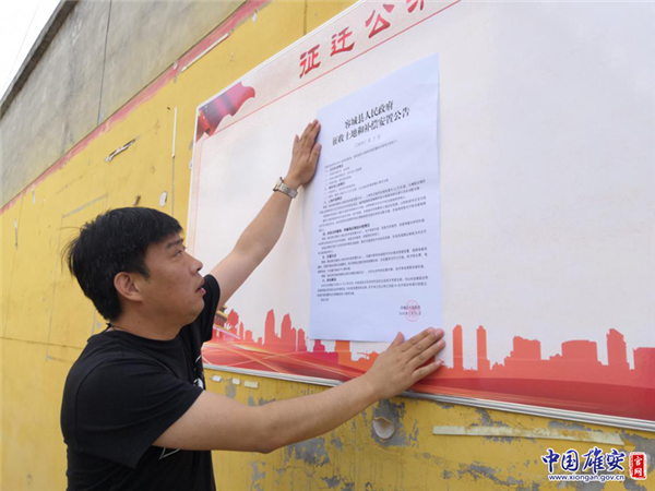 征收土地和補(bǔ)償安置公告,主要包括項目批準(zhǔn)情況、被征收土地情況、土地補(bǔ)償情況、房屋及附屬物、附著物及青苗補(bǔ)償情況、安置辦法和其他事項等六部分內(nèi)容。圖為駐村干部在小王營村張貼公告。中國雄安官網(wǎng)記者劉東堯 攝