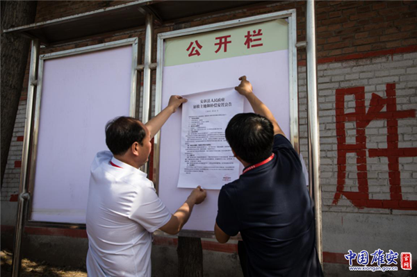 圖為駐村干部在西陽村張貼公告。中國雄安官網(wǎng)記者毛鶴然 攝